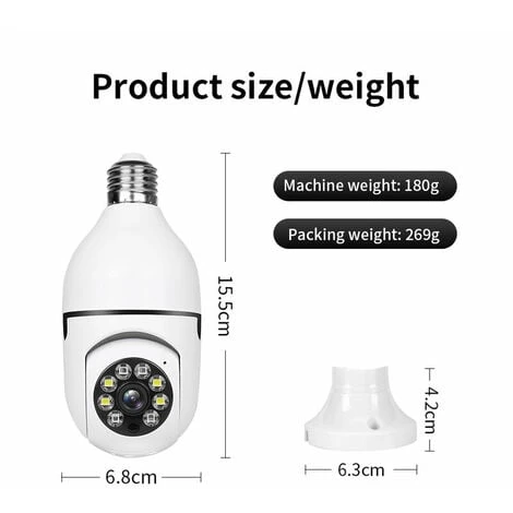 Installation sans fil et facile : La caméra prend en charge stockage en nuage et stockage sur carte micro SD. La caméra n’est pas livrée avec une carte SD, le stockage en nuage doit être payé. Cette caméra de sécurité peut être installée avec une base E27 standard (110V ~ 240V), plus aucune étape d’installation supplémentaire. Ensuite, tout ce que vous avez à faire est de connecter le système de caméra au routeur et d’ouvrir l’application pour configurer la caméra en quelques minutes.