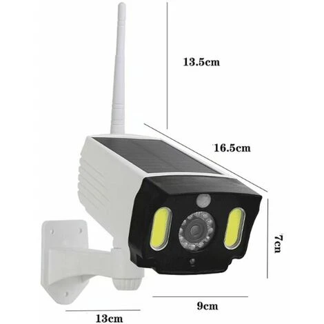 2 caméras factice avec panneau solaire. Objet optique avec détecteur de mouvement PIR : capteur de mouvement PIR intégré. Les lampes solaires peuvent détecter des objets en mouvement à une distance de 5 à 8 m . Champ de 120 degrés. La lumière s’allume en mode lumineux et reste allumée pendant 15 à 20 secondes. Lorsque le mouvement se déplace.
