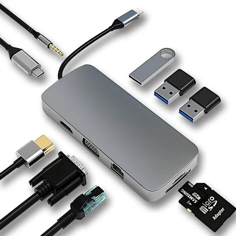 【HUB USB C 10 EN 1】 : L’adaptateur de hub USB-C est compatible avec tous les appareils qui contiennent des ports Type-C/USB, en particulier pour MacBook Pro et Air 10 -in-1 USB-C HUB comprend un USB3 .0 et deux ports USB2.0, un port PD, une sortie vidéo HDMI 4K, un port VGA mâle-femelle, une interface Ethernet RJ45 100M et une sortie audio, et des fentes pour lecteur de carte SD/Micro SD, compatible avec MacBook Pro / Air, Chromebook et autres appareils de type C.