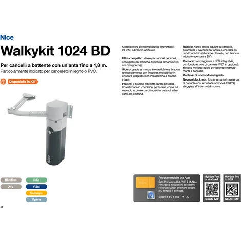 Walky, Kit per l’automazione di cancelli a battente con un’anta fino a 1,8 m, 24 Vdc, a braccio articolato, montaggio esterno, con tecnologia bidirezionale