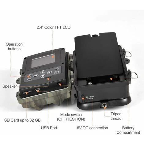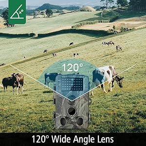 chaque mouvement à couper le souffle avec une consommation d’énergie réduite. Les 42 LED infrarouges améliorées sans flash lumineux peuvent vous permettre de capturer n’importe quel moment, même la nuit. - Objectif grand angle 120 ° & Appareil robuste étanche – La caméra de jeu est équipée d’une plage de détection de 120 ° vous permettant d’obtenir une excellente vue plus large. Elle enregistrera tous les mouvements d’animaux avec un objectif grand