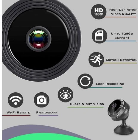 Mini caméra Full HD Wifi 1080P】Résolution 1080P et objectif grand angle de 150°, une plus grande portée de vision et capture les détails clairement. Fonction avec vidéo, image, enregistrement en boucle, détecteur de mouvement, vision nocturne infrarouge, affichage de l’heure, magnétique, etc.