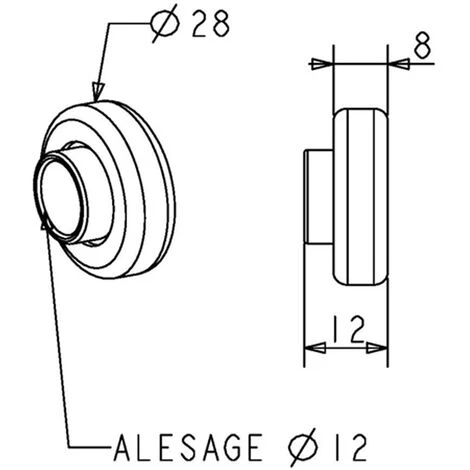 Le roulement à billes s’utilise principalement dans les concepts coffre PVC, coffre rénovation alu extérieur, et traditionnel spécifique pour des manoeuvres dites entres joues. Utilisation avec des volets roulants de poids Maxi : 25 kg Ce roulement est composé des éléments suivants : une cage extérieure en tôle d’acier emboutie zinguée une cage intérieure en acier décolleté zinguée de billes en acier graissées Son diamètre extérieur de 28 correspond à un standard rencontré dans les concepts de volet roulant. Dimensions (voir schéma ci-contre) : Diamètre : 28 mm Alésage 12 Epaisseur : 8 mm / 12 mm Pièce vendue à l’unité